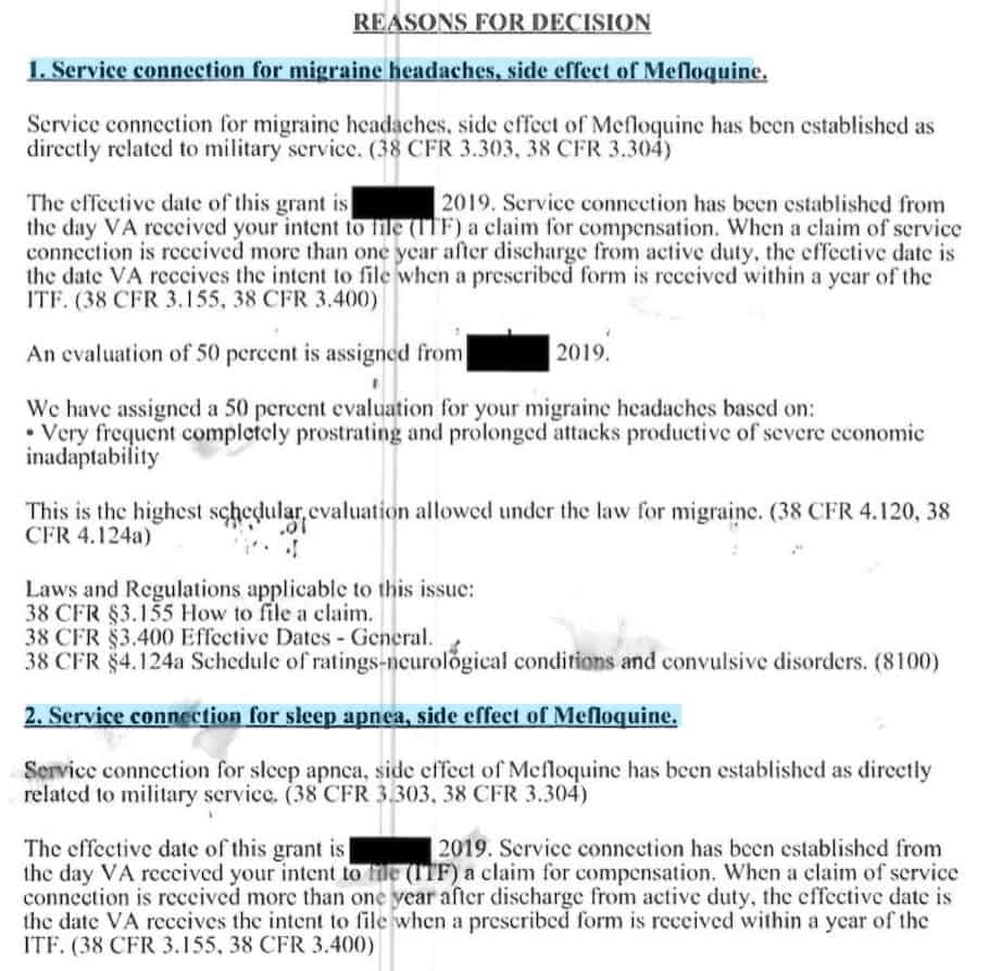 These ratings are made possible by the provision of expert medical opinion. The Quinism Foundation is working to expand access to such nexus letter and independent medical opinion services in support of mefloquine-related claims, and is hoping to begin to subsidize or charitably fund such services in the coming year for needy veterans. Your support of the foundation’s activities will help make this possible.