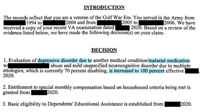 In a another case, the VA has awarded a 100% rating for a depressive disorder attributed to mefloquine.